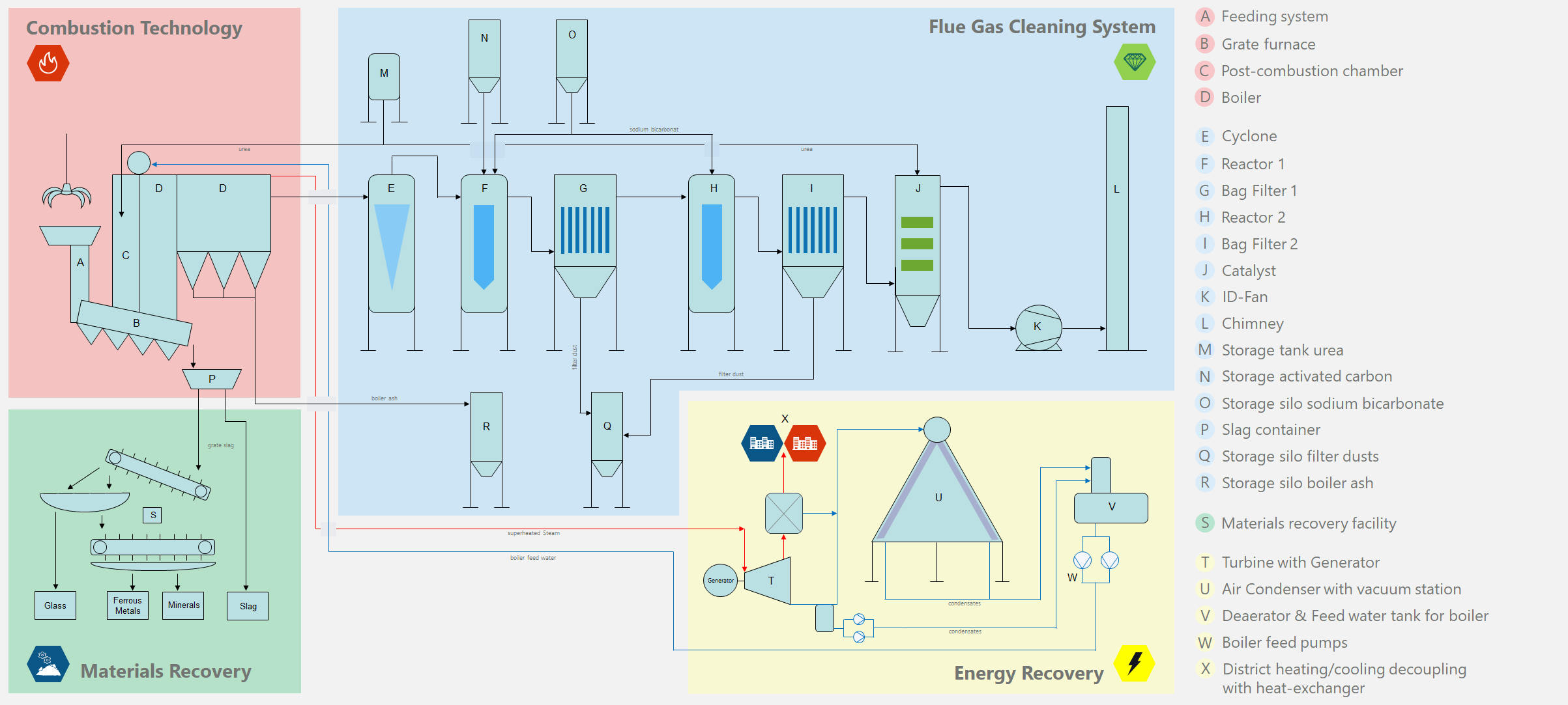 The following storage systems are provided for the residual waste collection and the necessary resources (additives) for the flue gas cleaning system:
